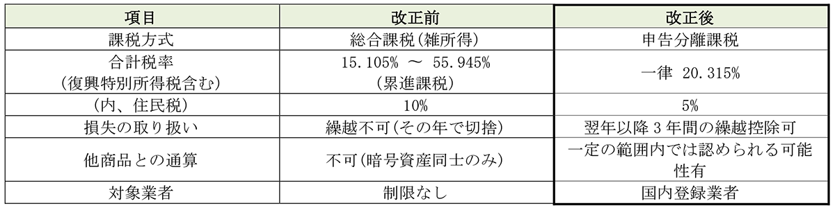 従来は暗号資産の取引によって生じた所得は、取引形態を問わず原則として雑所得(総合課税)とされてきました。今後は登録された国内の交換業者を通じた特定暗号資産(2①参照)の譲渡等により生じる所得に限り、20.315%の申告分離課税が適用される見込みです。対象となる取引については(2)②に注意が必要です