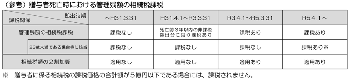 上記のように、贈与者死亡時における管理残額の相続税課税関係は、教育資金の拠出時期により異なることとなりますので、まとめますと下記表のとおりとなります。