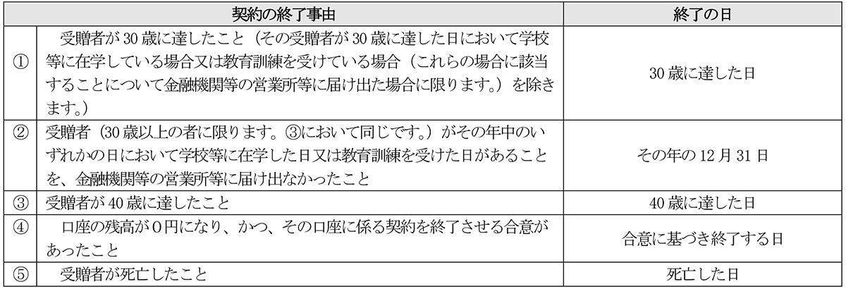 教育資金口座に係る契約は、次の①〜⑤の事由に応じ、それぞれに定める日のいずれか早い日に終了します。