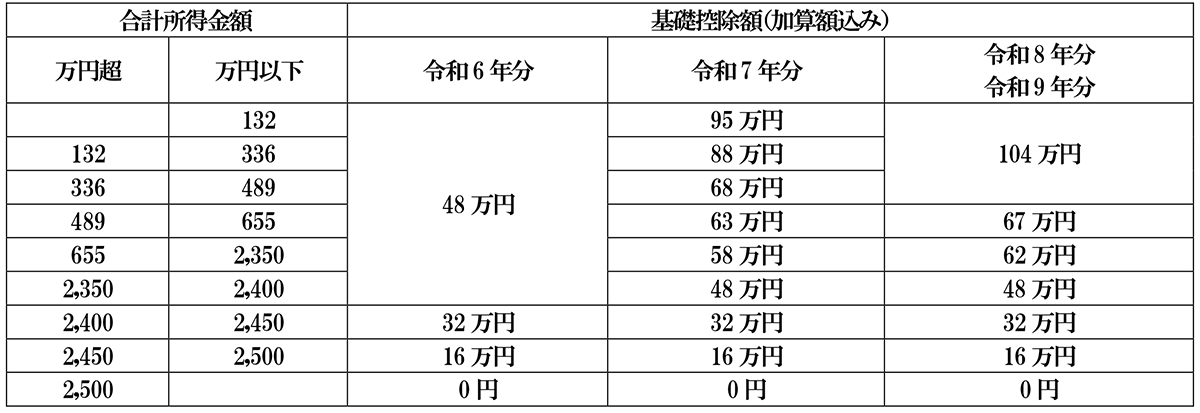 所得税の基礎控除額は、(合計所得金額2,500万円以下であれば)誰でも所得税の課税対象額の計算上控除される金額です。令和7年分以降は、合計所得金額が2,350万円以下は10万円引き上げをするとともに、合計所得金額655万円以下である場合には加算額が設けられます。