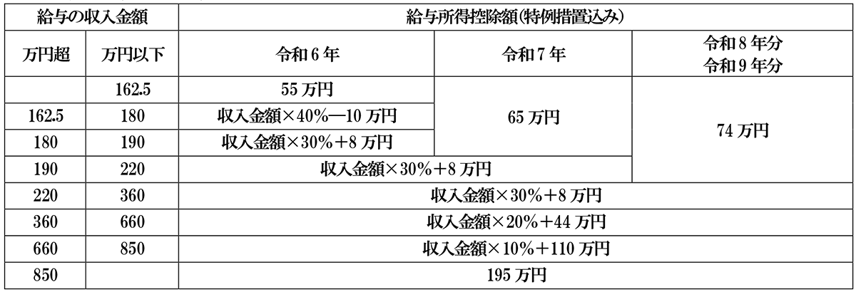 給与所得控除額は、給与所得者について収入金額から一定の金額を控除した金額を経費相当額として控除するために設けられています。令和7年以降は給与の収入金額が190万円以下の場合は一律最低でも65万円の控除額とし、令和8年以降は、給与の収入金額が220万円以下の場合は一律最低でも69万円の控除額とするとともに、特例措置として5万円控除額を加算する措置が設けられます。