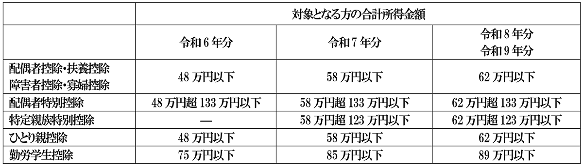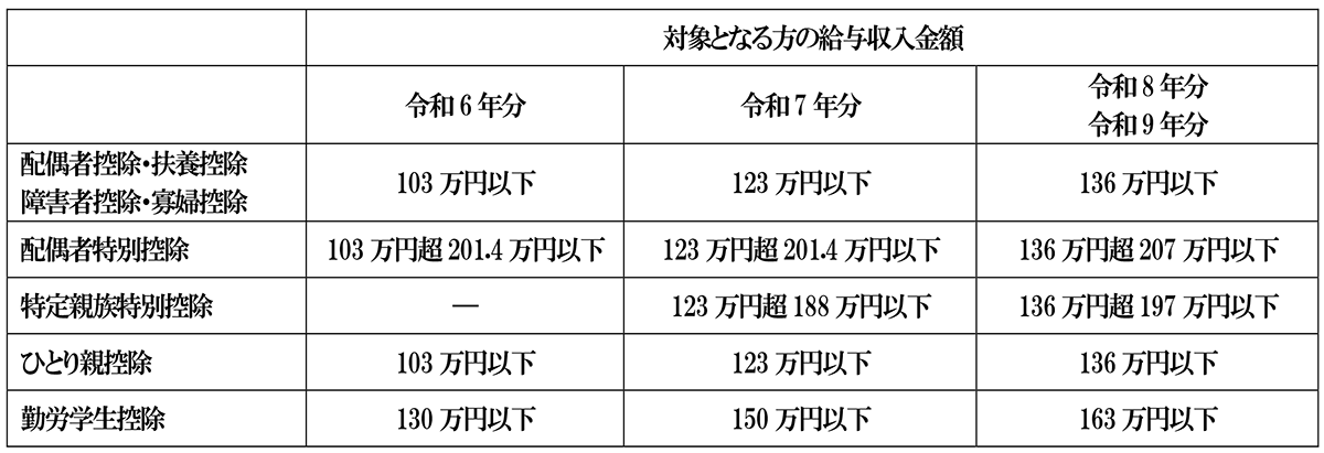 上記の2つの改正に伴い、主たる所得者の配偶者や扶養親族が、控除対象者として配偶者控除や扶養控除などの控除対象者となるのかどうか変わっています。
