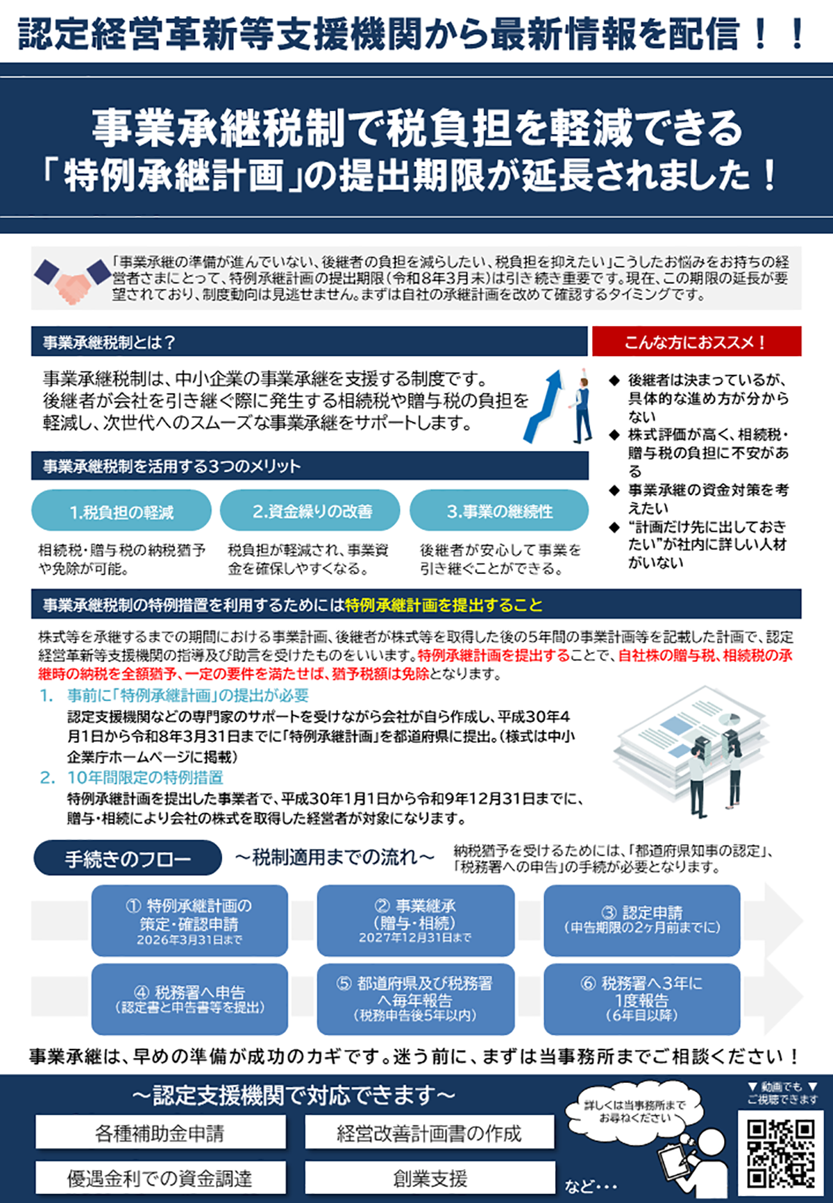 事業承継税制 2025年12月02日 補助金等最新情報 事業承継税制は、中小企業の事業承継を支援する制度です。 後継者が会社を引き継ぐ際に発生する相続税や贈与税の負担を軽減し、次世代へのスムーズな事業承継をサポートします。