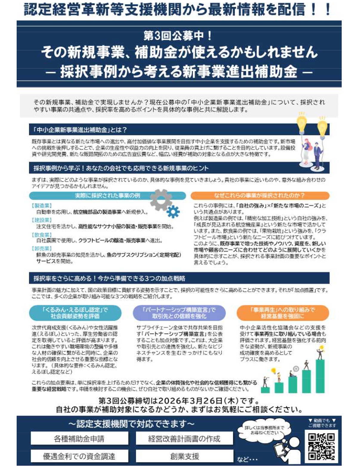 中小企業新事業進出補助金 2026年02月03日 補助金等最新情報 既存事業とは異なる新たな市場への進出や、高付加価値な事業展開を目指す中小企業を支援するための補助金です。新市場への挑戦を後押しすることで、企業の生産性や収益力の向上を図り、従業員の賃上げに繋げることを目的としています。 設備投資や研究開発費、新たな販路開拓のための広告宣伝費など、幅広い経費が補助の対象となる点が大きな特徴です。