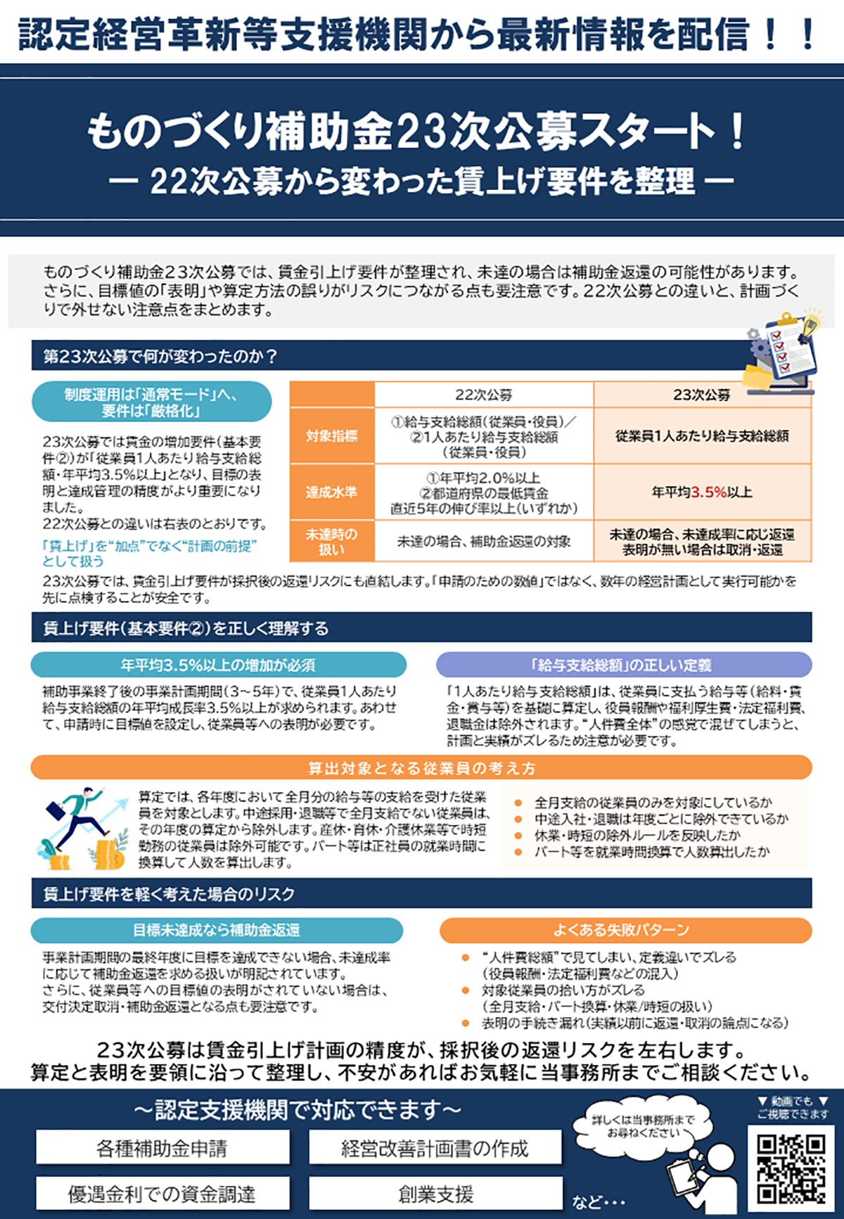 ものづくり補助金23次公募開始 2026年03月02日 補助金等最新情報 ものづくり補助金23次公募では、賃金引上げ要件が整理され、未達の場合は補助金返還の可能性があります。さらに、目標値の「表明」や算定方法の誤りがリスクにつながる点も要注意です。22次公募との違いと、計画づくりで外せない注意点をまとめます。