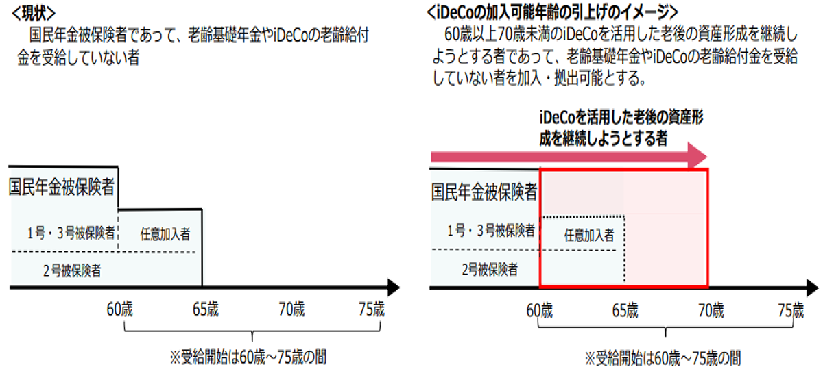 現在の要件に加え、公的年金への保険料を納めつつ、上乗せとしての私的年金に加入してきた者が、60歳から70歳にかけて引き続き老後の資産形成を継続できるようにするため、60歳以上70歳未満のiDeCoを活用した老後の資産形成を継続しようとする者であって、老齢基礎年金やiDeCoの老齢給付金を受給していない者にiDeCoの加入・継続拠出が認められました。