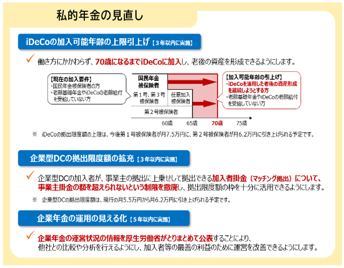 現在の制度では、iDeCoに加入できる方は、老齢基礎年金やiDeCoの老齢給付金を受給していない国民年金の被保険者に限られており、働き方により何歳まで加入できるかについて、上限の年齢に差が生じています。このため、働き方に関係なく、誰もが長期的に老後資金を形成でき、かつ加入者にとってシンプルでわかりやすい制度となるように加入要件が拡充されました。