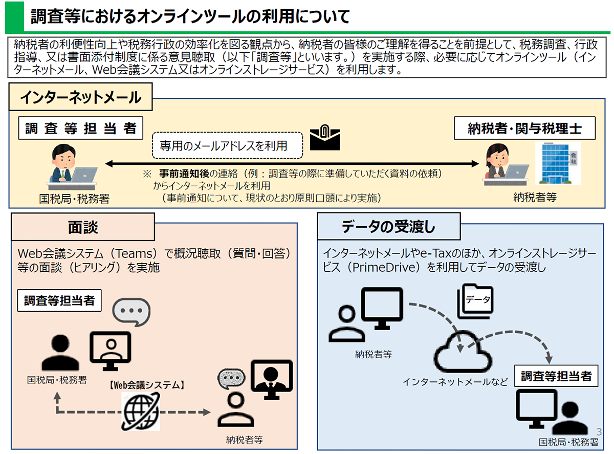 税務調査等の際にも、必要に応じて上記のようなオンラインツールを利用するとしています。