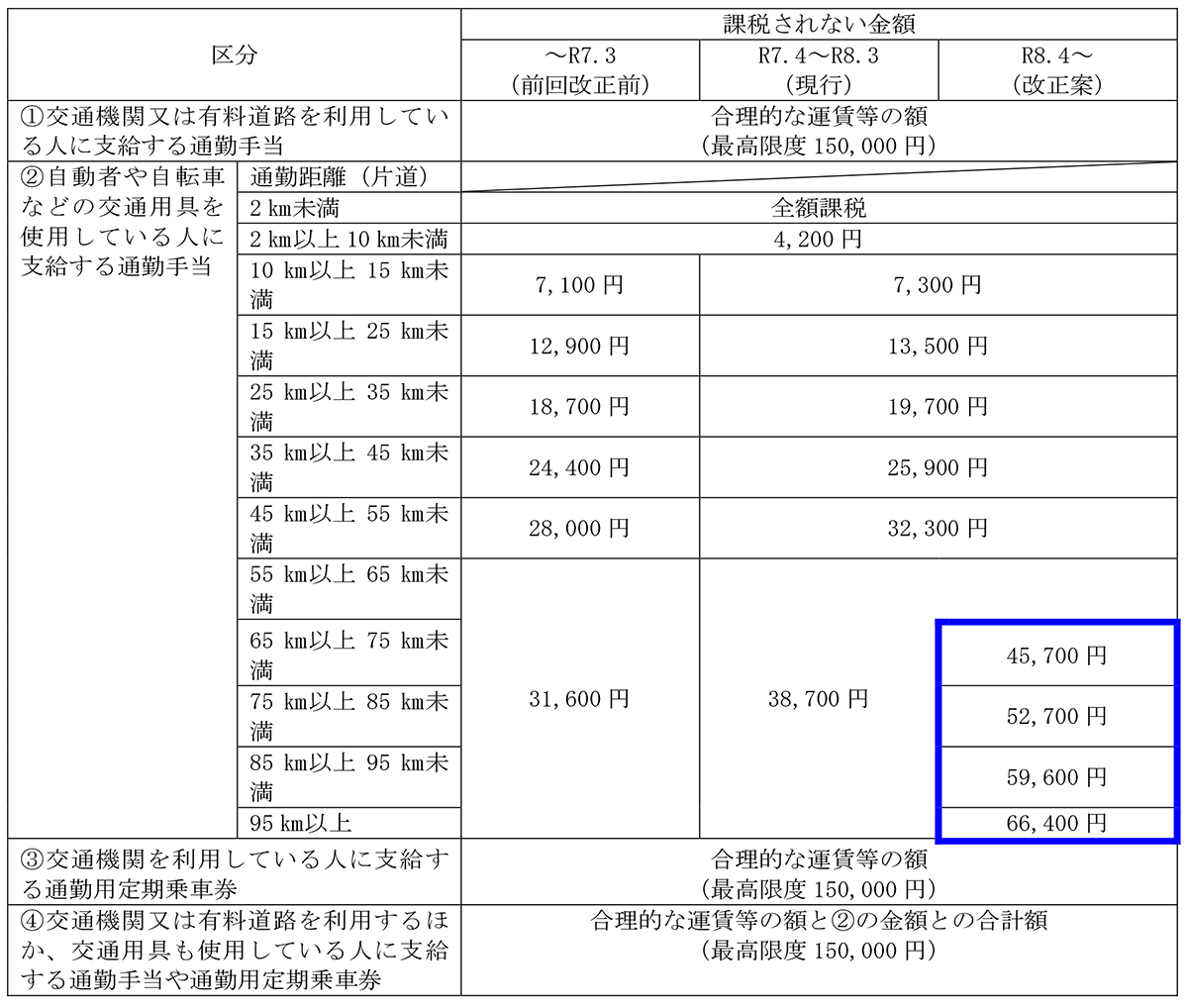 令和8年度の税制改正大綱では、さらに通勤距離が片道65㎞以上の者の1月当たりの非課税限度額が引き上げられる見込みです。