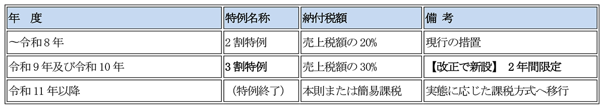免税事業者がインボイス登録をして課税事業者になった際、納税額を売上税額の一定割合に抑える特例です。改正により、激変緩和措置として、個人事業者に限り、新たに「3 割特例」が新たに加わります。この措置は、令和9年及び令和10年の2年に限り適用されます。