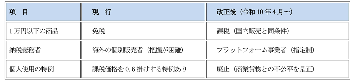 海外事業者との公平性を確保するため、少額輸入貨物への課税及びプラットフォーム(PF)課税が導入されます 。通信販売で輸入される1万円以下の貨物(特定少額資産)も課税対象となります 。国外事業者がプラットフォーム(PF)を介して販売する場合、PF事業者が消費税をまとめて納税する義務を負います 。