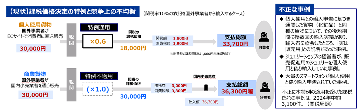 輸入取引が小売取引の段階による輸入貨物等で、輸入者の個人的な使用に供されるもの(個人使用貨物)の課税価格を、海外小売価格に0.6を乗じて卸売価格相当として算出する特例(課税価格決定の特例)