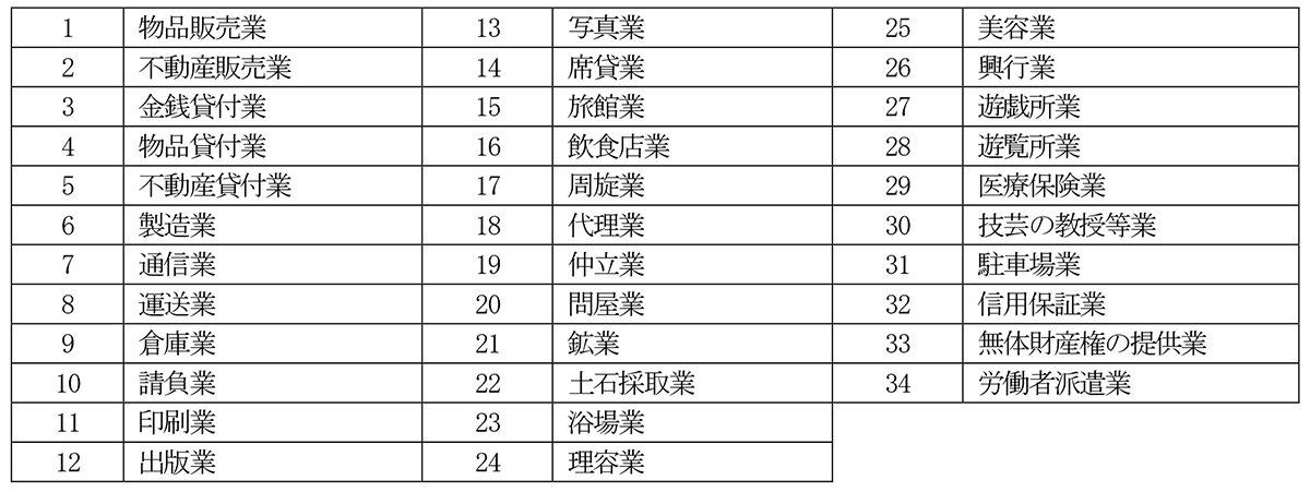 収益事業とは、「継続」して「事業所を設けて」行われるもので、「政令で定められた次の34事業」をいいます。