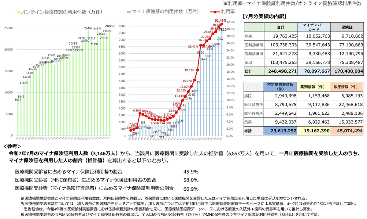 令和7年7月27日時点でのオンライン資格確認・マイナ保険証の利用状況は以下の図のとおりです。